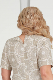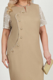 5961 Платье женское Платье женское полуприлегающего силуэта, зауженное к низу. Перед выполнен из однотонного льна, спинка и рукава выполнены из ткани лен принт. Длина по среднему шву спинки 104 см. Левая часть переда с нагрудной вытачкой, идущей из проймы, ассиметричной формы с фигурным краем, выходящим из разреза горловины, и уходящим в правый боковой шов. Фигурный срез обработан обтачкой из принтованного льна, с перекантом в 0,3 см. Край левой фигурной части переда с 7-ю глазковыми петлями и 7-ю пуговицами. Спинка с талиевыми вытачками, со средним швом, в верхней части которого расположена застежка на потайную тесьму- молнию, в нижней части- шлица. Горловина переда и спинки округлая, обтачная, по переду углубленная переходящая в разрез. Рукава втачные, одношовные. Длина рукавов 25,5 см. Платье с плечевыми накладками.