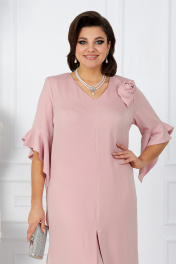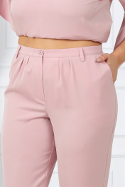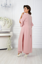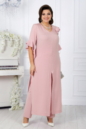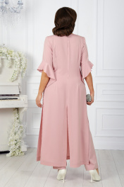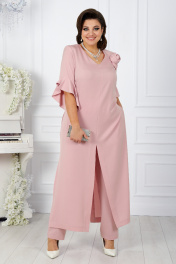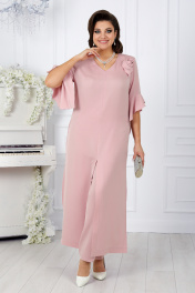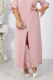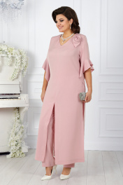 5990 Комплект брючный Представляем вашему вниманию вечерний брючный костюм, созданный с особым вниманием к стилю и комфорту женщин больших размеров. Этот изысканный комплект выполнен из высококачественного сатина, придавая вашему образу нежность и элегантность. Длинная туника этого костюма не только подчеркивает его изысканный характер, но и служит важным элементом создания правильного силуэта для женщин с великолепными формами. Ее линии и длина прекрасно балансируют фигуру, придавая ей гармоничность и элегантность. Комплект брючный 2-х предметный, состоящий из туники и брюк, выполненных из плательной ткани «сатин». Туника полуприлегающего силуэта. Длина по среднему шву спинки 136 см. Перед с нагрудными вытачками, идущими из пройм, с центральным средним швом, в нижней части которого обработан разрез. Спинка с талиевыми вытачками, со средним швом, в верхней части которого расположена застежка на потайную тесьму-молнию, в нижней части-разрез. Ширина отделочной строчки по центральным разрезам переда и спинки-4,0 см. В боковых швах переда и спинки разрезы расположены от уровня талии до низа. Ширина отделочной строчки по боковым разрезам-1,0 см. Горловина переда V-образной формы, горловина спинки округлая. Рукава втачные, одношовные, с притачными по низу фигурными обтачными воланами. Длина рукава от плечевого шва до низа волана - 36 см, длина рукава по нижнему шву до низа волана-59 см. Туника с плечевыми накладками, со съемным декоративным цветком «роза», выполненным из основной ткани. Брюки классические, с посадкой на талии, на притачном поясе с 5-ю шлевками, с застёжкой на тесьму-«молния», расположенную в среднем шве передних половинок, и 1 петлю и 1 пуговицу на поясе. Передние половинки брюк с двумя, застроченными от пояса вниз, односторонними складками, с боковыми наклонными карманами. Задние половинки брюк с талиевыми вытачками, идущими от пояса вниз. Для лучшего прилегания брюк в области талии в поясе по задним половинкам вставлена резинка.