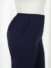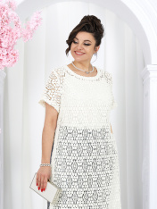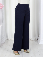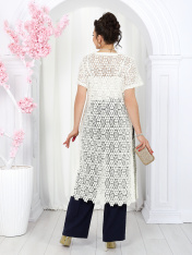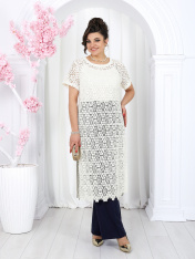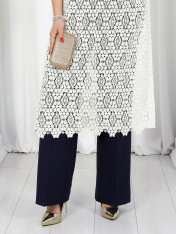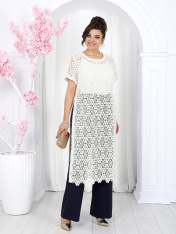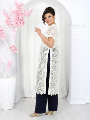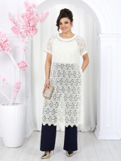 6055 Комплект брючный Представляем вашему вниманию летний брючный костюм, выполненный из натуральной ткани. Нарядная туника из вязаного кружева придаёт образу благородство и изысканность. Классические брюки с безупречной посадкой визуально вытягивают силуэт и делают его стройнее. Базовый топ завершает ансамбль, добавляя практичности и элегантности. Натуральная ткань обеспечивает дышащий эффект, поддерживая комфорт в теплую погоду. Этот праздничный костюм - настоящая находка для вашего гардероба. Он идеально подойдет для офиса, деловых встреч, а также для праздничных мероприятий или летних вечеров. Комплект брючный 3-х предметный, состоящий из туники, блузки и брюк. Туника полуприлегающего силуэта, выполнена из хлопкового кружева. Модель без застежки, без плечевых накладок, с высокими (от талии) разрезами в боковых швах. С изнанки разрезы обработаны хлопковой тесьмой в цвет кружева, закрепленной с лицевой стороны отделочной строчкой шириной 3 см. Круглый вырез горловины переда и спинки обработан обтачкой из костюмно-плательной ткани в цвет кружева; ширина отделочной строчки по горловине 2 см. Рукав втачной, короткий. Длина туники – 117 см; длина рукава – 22 см. Блузка-топ прилегающего силуэта, выполнена из вискозного трикотажного полотна. Модель без застежки, без рукавов, на регулируемых по длине узких бретелях. Верхний край переда окантован. Для лучшего прилегания изделия, в подгибку верхнего края спинки протянута эластичная лента. Длина топа (по спинке) – 37 см. Брюки классические, длинные, с посадкой на талии, выполнены из ткани «лен-вишер». Модель со стрелками. Передние и задние половинки брюк с талиевыми вытачками, направленными от пояса вниз. Спереди обработаны наклонные боковые карманы и центральная застёжка на тесьму-«молнию». Притачной пояс застегивается на 1 петлю и 1 пуговицу; для лучшего прилегания по линии талии в притачном поясе предусмотрена эластичная лента, вставленная по спинке. Длина брюк по боковому (с поясом) -- 107 см (50-52 р-р), 108 см (54-58 р-р)