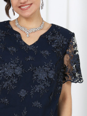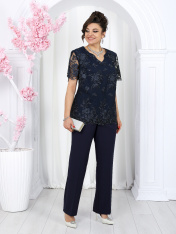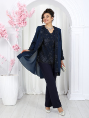6066 Комплект брючный Представляем роскошную вечернюю тройку — идеальный ансамбль для особых случаев! Костюм сочетает воздушный кардиган, соблазнительную блузку и безупречные брюки, создавая образ абсолютной женственности и утончённого шика. Сияние гипюра и струящийся шифон создают образ для особых случаев. Лёгкие дышащие ткани позволяют выглядеть безупречно весь вечер. Комплект брючный 3-х предметный, состоящий из кардигана, блузки и брюк. Кардиган силуэта «трапеция», выполнен из плательного шифона. Модель без подкладки, без застежки, воротника и плечевых накладок. Низ изделия асимметричный -- спинка относительно переда удлинена к центру. Борта и горловина спинки обработаны фигурной планкой. Рукав втачной, длиной ¾; по низу рукава разрез, оформленный закругленными планками в виде «арки»; низ разреза и концы манжеты зафиксированы закрепкой. Верхний слой манжеты, планки борта и разреза рукава выполнен из гипюра. Длина кардигана (по спинке) – 102 см; длина рукава (с манжетой) – 58 см. Блузка полуприлегающего силуэта. Модель без подкладки, без застежки и воротника, с плечевыми накладками. На спинке обработаны талиевые вытачки, горловина окантована узкой косой бейкой. Перед двухслойный: нижний слой из плательного шифона, верхний -- из гипюра с фестонами по низу; на обоих слоях обработаны нагрудные вытачки, направленные от пройм. Горловина переда с V-образным вырезом, край имеет форму «волны». Рукав втачной, короткий, выполнен из гипюра и по низу оформлен фестонами. Длина блузки – 66 см; длина рукава – 24 см. Брюки классические, длинные, с посадкой на талии, выполнены из костюмно- плательной ткани. Модель со стрелками. Передние и задние половинки брюк с талиевыми вытачками, направленными от пояса вниз. Спереди обработаны наклонные боковые карманы и центральная застёжка на тесьму-«молнию». Притачной пояс застегивается на 1 петлю и 1 пуговицу; для лучшего прилегания по линии талии в притачном поясе предусмотрена эластичная лента, вставленная по спинке. Длина брюк по боковому (с поясом) – 103 см (52-54 р-р), 104 см (56-60 р-р).
