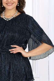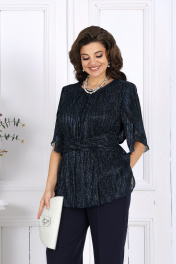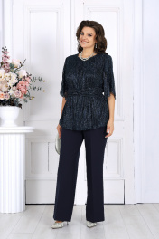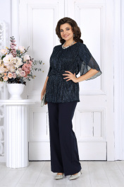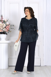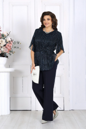 6069 Комплект брючный Этот праздничный костюм двойка для полных женщин — воплощение современного понимания нарядной элегантности: лёгкий, удобный, стильный и бесконечно женственный. Блузка выполнена из изысканной сетки-гофре с люрексом, которая мягко переливается при каждом движении, создавая благородное сияние. Внутренняя трикотажная подкладка обеспечивает комфорт и делает посадку идеальной даже для полных женщин. Фигурный крой и драпированный пояс с перекрутом формируют женственный силуэт — акцентируют талию, визуально вытягивая фигуру и делая её стройнее. Рукава особого фасона с разрезом добавляют легкости и движения образу, придавая наряду современное звучание и ощущение воздушности. Брюки из костюмной ткани идеально дополняют верх, создавая лаконичную вертикаль, которая делает образ ещё более пропорциональным. Этот костюм станет вашим универсальным решением: праздничный вечер, деловая встреча, торжественный ужин или новогодний приём — он уместен везде. Блузка с благородным мерцанием делает образ утончённым и эффектным, придавая нотку торжественности без излишнего блеска. Комплект брючный 2-х предметный, состоящий из блузки и брюк. Блузка женская, приталенного силуэта, выполнена из сетки-гофре с нитью «люрекс». Модель на трикотажной подкладке, без застежки и плечевых накладок. Перед дополнен задрапированным поясом с перекрутом, концы которого входят в боковые швы. Для лучшего прилегания по линии талии спинки предусмотрена кулиса с протянутой внутрь эластичной лентой. Горловина округлая, окантована узкой косой бейкой из основного материала. Рукав короткий, расширенный, с фигурным низом, переходящим в разрез, края которого по окату скреплены на запах. Длина блузки – 70 см; длина рукава (на продолжении плечевого шва) – 32 см. Брюки классические, длинные, с посадкой на талии, выполнены из костюмно- плательной ткани. Модель со стрелками. Передние и задние половинки брюк с талиевыми вытачками, направленными от пояса вниз. Спереди обработаны наклонные боковые карманы и центральная застёжка на тесьму-«молнию». Притачной пояс застегивается на 1 петлю и 1 пуговицу; для лучшего прилегания по линии талии в притачном поясе предусмотрена эластичная лента, вставленная по спинке. Длина брюк по боковому (с поясом) – 107 см (50-52 р-р), 108 см (54-58 р-р).