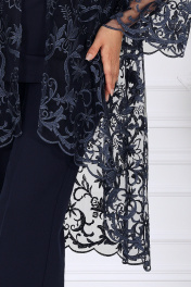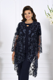 6078 Комплект брючный Роскошный и в то же время практичный костюм-тройка создан для женщин, которые ценят комфорт, безупречный крой и изысканный стиль. Он идеально подойдёт для торжественных мероприятий, свадеб, деловых приёмов, корпоративных вечеров и любых событий, где хочется выглядеть эффектно и уверенно. Воздушный гипюровый кардиган прямого силуэта с удлинённой спинкой и фигурными фестонами по краю создаёт лёгкость и утончённость образа. Полуприлегающая блузка из эластичного трикотажа «масло» мягко повторяет линии фигуры, не сковывая движения. Классические прямые брюки из костюмно-плательной ткани со стрелками визуально вытягивают силуэт, формируя изящные пропорции и обеспечивая комфорт в течение всего дня. Такой костюм подчеркнёт вкус и статус своей обладательницы, оставаясь универсальным решением для множества событий — от официальных встреч до праздничных торжеств. Комплект брючный 3-х предметный, состоящий из кардигана, блузки и брюк. Кардиган прямого силуэта, выполнен из гипюра. Модель без застежки, без подкладки и плечевых накладок. Низ кардигана удлинен по спинке. Рукав втачной, длинный. Низ изделия и низ рукава оформлены фестонами. Длина кардигана – 109 см; длина рукава – 58,5 см. Блузка полуприлегающего силуэта, выполнена из трикотажного полотна «масло». Модель без плечевых накладок. Горловина округлой формы, спереди оформлена фигурным вырезом и отрезной бейкой. Рукав короткий, втачной. Длина блузки – 63 см; длина рукава – 23 см. Брюки классические, длинные, с посадкой на талии, выполнены из костюмно- плательной ткани. Модель со стрелками. Передние и задние половинки брюк с талиевыми вытачками, направленными от пояса вниз. Спереди обработаны наклонные боковые карманы и центральная застёжка на тесьму-«молнию». Притачной пояс застегивается на 1 петлю и 1 пуговицу; для лучшего прилегания по линии талии в притачном поясе предусмотрена эластичная лента, вставленная по спинке. Длина брюк по боковому (с поясом) – 107см (50-52 р-р), 108 см (54-58 р-р).