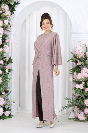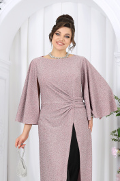 6084 Комплект брючный Этот элегантный костюм-двойка создан для женщин, которые ценят комфорт и изысканность в равной мере. Он словно приглашает сиять — мягкий блеск люрекса переливается в свете вечерних огней, создавая атмосферу праздника даже в обычный день. Туника свободно струится по фигуре, легко скрывая всё лишнее и подчеркивая достоинства. Драпировка по линии талии формирует красивый силуэт «песочных часов», а асимметричный запах добавляет образу динамики и утончённости. Эффектные рукава придают наряду торжественность, сохраняя при этом абсолютную лёгкость движений. Каждая деталь продумана до мелочей — от мягкой подкладки, обеспечивающей комфорт, до аккуратной потайной застёжки, сохраняющей чистоту линий. Этот наряд универсален: он уместен на праздничном приёме, корпоративе или ужине в ресторане, а также станет идеальным выбором для торжественных семейных событий. В нём комфортно, уверенно и красиво — именно так выглядит настоящая женственность в современном прочтении. Комплект брючный 2-х предметный, состоящий из туники и брюк. Туника полуприлегающего силуэта с расширением к низу, выполнена из трикотажного полотна с фактурной лицевой стороной «люрекс». Модель отрезная по линии талии; верхняя часть переда и спинки (лиф) на трикотажной подкладке. Лиф переда с одним рельефным швом, направленным от левой проймы; нижняя часть переда состоит из двух деталей, скрепленных на запах. По линии талии, вдоль рельефа, перед задрапирован сборкой и односторонними складками. На спинке обработаны талиевые вытачки и средний шов с застежкой на потайную тесьму-«молнию» (50 см). Вырез горловины спинки и переда формы «лодочка». Рукав без шва, с отлетными краями; крепится к пройме только в верхней части. Длина туники – 139 см; длина рукава – 51 см. Брюки классические, длинные, с посадкой на талии, выполнены из костюмно- плательной ткани. Модель со стрелками. Передние и задние половинки брюк с талиевыми вытачками, направленными от пояса вниз. Спереди обработаны наклонные боковые карманы и центральная застёжка на тесьму-«молнию». Притачной пояс застегивается на 1 петлю и 1 пуговицу; для лучшего прилегания по линии талии в притачном поясе предусмотрена эластичная лента, вставленная по спинке. Длина брюк (с поясом) – 102 см (50-52р-р); длина брюк (с поясом) – 103 см (54-58р-р).