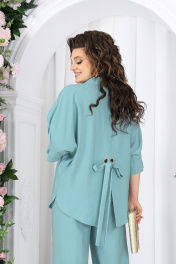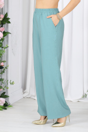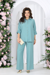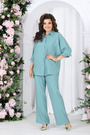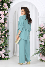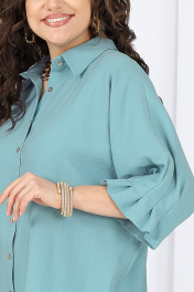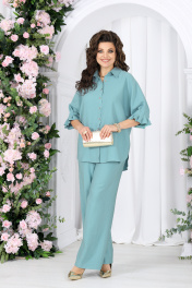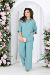 6102 Комплект брючный Элегантный женский брючный костюм от белорусского бренда NINELE CHIC — универсальное решение для офиса, повседневных образов и праздничных выходов. Модель выполнена из натуральной вискозной ткани, которая приятно ощущается на теле, хорошо пропускает воздух и идеально подходит для весенне-летнего сезона. Костюм-двойка состоит из стильной блузки свободного прямого силуэта и удобных прямых брюк. Блузка с цельнокроеным рукавом ¾ и асимметричным низом мягко скрывает особенности фигуры, визуально вытягивает силуэт и смотрится современно и женственно. Оригинальная конструкция спинки с запахом и завязкой добавляет образу изюминку и обеспечивает комфортную посадку, особенно в больших размерах. Этот костюм станет отличным выбором для работы в офисе, деловых встреч, торжественных мероприятий, семейных праздников и стильных повседневных образов. Брюки прямого кроя с эластичным поясом не сковывают движения, комфортны в течение всего дня и подходят женщинам с пышными формами. Боковые карманы добавляют практичности, а лаконичный дизайн позволяет легко комбинировать костюм с обувью на каблуке или на плоском ходу. Комплект брючный 2-х предметный, состоящий из блузки и брюк. Блузка прямого силуэта, выполнена из вискозного полотна. Модель с цельнокроеным рукавом и асимметричным низом. Перед с застежкой по цельнокроеной планке на 7 петель и 7 пуговиц. Спинка состоит из двух частей, скрепленных по горловине на запах, а по линии талии зафиксированных завязкой, продетой в люверсы. Низ переда и спинки закруглен к боковым швам и переходит в разрезы; низ спинки удлинен относительно переда и оформлен углами в центральной части. Горловина оформлена отложным воротником на отрезной стойке. Рукав цельнокроеный, длиной ¾; в нижней части застрочено 5 вертикальных, односторонних складок. Длина блузки – 74 см (50-58 р-р); длина рукава (от горловины) – 52 см (50-52 р-р), 54 см (54-58 р-р). Брюки длинные, прямого силуэта, с посадкой на талии, выполнены из вискозного полотна. Модель без стрелок, без застежки, с наклонными боковыми карманами, на притачном поясе с эластичной лентой внутри. Спереди обработаны наклонные боковые карманы. Длина брюк по боковому (с поясом) – 106 см (50-52 р-р), 107 см (54-58 р-р).