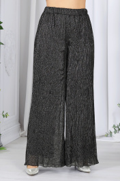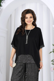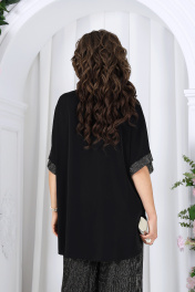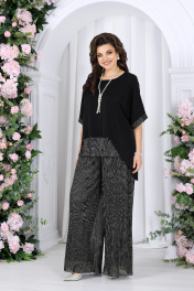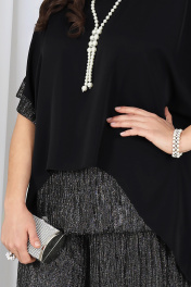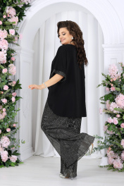 6104 Комплект брючный Праздничный брючный костюм от NINELE CHIC — элегантность, в которой удобно. Идеальный выбор для женщин, которые хотят выглядеть нарядно, современно и уверенно, не жертвуя комфортом. Этот костюм-двойка от белорусского бренда NINELE CHIC создан для особых случаев и красивых выходов — когда важно произвести впечатление и чувствовать себя свободно. Свободная блузка из шифона стрейч мягко струится по фигуре, визуально вытягивает силуэт и деликатно скрывает зону живота и бёдер. Декоративные элементы из сетки-гофре с люрексом придают образу благородное сияние и делают костюм по-настоящему вечерним. Широкие брюки на эластичном поясе не сковывают движений, комфортно садятся по талии и подходят для больших размеров и фигуры plus size. Модель смотрится эффектно как на торжестве, так и на праздничном ужине или мероприятии. Комплект брючный 2-х предметный, состоящий из блузки и брюк. Блузка расширенного силуэта, выполнена из шифона стрейч. Модель на трикотажной подкладке, без застежки и плечевых накладок. Горловина округлая. Рукав цельнокроенный короткий. Низ рукава и низ блузки оформлены отделочными деталями из ткани сетка - гофре с нитью «люрекс» Длина блузки по середине спинки – 80 см; длина рукава от горловины (с манжетой) –41 см. Брюки длинные, широкие, свободные, на трикотажной подкладке. Брюки на притачном поясе на эластичной ленте внутри, выполнены из ткани сетка -гофре с нитью «люрекс». Модель без стрелок, низ брюк обработан швом «флэш». Длина брюк по боковому (с поясом)- 107 см.