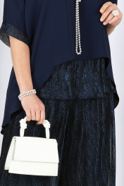 6104 Комплект брючный Праздничный брючный костюм от NINELE CHIC — элегантность, в которой удобно. Идеальный выбор для женщин, которые хотят выглядеть нарядно, современно и уверенно, не жертвуя комфортом. Этот костюм-двойка от белорусского бренда NINELE CHIC создан для особых случаев и красивых выходов — когда важно произвести впечатление и чувствовать себя свободно. Свободная блузка из шифона стрейч мягко струится по фигуре, визуально вытягивает силуэт и деликатно скрывает зону живота и бёдер. Декоративные элементы из сетки-гофре с люрексом придают образу благородное сияние и делают костюм по-настоящему вечерним. Широкие брюки на эластичном поясе не сковывают движений, комфортно садятся по талии и подходят для больших размеров и фигуры plus size. Модель смотрится эффектно как на торжестве, так и на праздничном ужине или мероприятии. Комплект брючный 2-х предметный, состоящий из блузки и брюк. Блузка расширенного силуэта, выполнена из шифона стрейч. Модель на трикотажной подкладке, без застежки и плечевых накладок. Горловина округлая. Рукав цельнокроенный короткий. Низ рукава и низ блузки оформлены отделочными деталями из ткани сетка - гофре с нитью «люрекс» Длина блузки по середине спинки – 80 см; длина рукава от горловины (с манжетой) –41 см. Брюки длинные, широкие, свободные, на трикотажной подкладке. Брюки на притачном поясе на эластичной ленте внутри, выполнены из ткани сетка -гофре с нитью «люрекс». Модель без стрелок, низ брюк обработан швом «флэш». Длина брюк по боковому (с поясом)- 107 см.