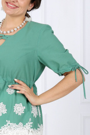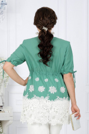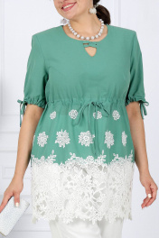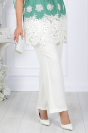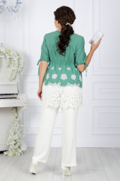 7417 Комплект брючный Представляем вашему вниманию нарядный летний костюм, созданный специально для женщин больших размеров. Изготовленный из натуральной хлопковой ткани, этот костюм объединяет стиль и комфорт, предоставляя возможность подчеркнуть свою утонченность в любой обстановке. Блузка с кулиской и свободные брюки обеспечивают невероятное ощущение свободы и легкости, что делает этот костюм идеальным выбором для летнего сезона. Натуральная хлопковая ткань обеспечивает дышащий эффект, поддерживая комфорт в теплую погоду. Комплект брючный 2-х предметный, состоящий из блузки, выполненной из плательной ткани, и брюк из однотонной ткани. Блузка полуприлегающего силуэта, отрезная выше линии талии с кулисой, нижняя часть блузки оформлена декоративным кружевом. Длина изделия по среднему шву спинки 81 см. Перед с вытачками, идущими от пройм до низа. На переде, по центру кулисы, обработаны 2 петли, через которые протянут шнур для регулировки сборки по талии. По центру переда от горловины вниз обработан разрез U- образной формы в который вставлены 2 декоративные детали, переплетающиеся между собой в виде петель. Горловина спинки округлой формы, по переду округлая, углубленная. Рукава втачные, одношовные, по низу обработанные кулисой. По низу рукавов, по центру кулисы, обработаны по 2 петли, через которые протянут шнур для регулировки сборки по рукаву. Длина рукавов 29 см. Блузка с плечевыми накладками. Брюки с посадкой на талии, длиной по боковому шву 106 см, с учетом пояса, зауженные к низу, на притачном поясе с резинкой вдоль всего пояса.