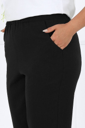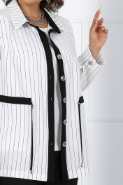 7463 Комплект брючный Брючный костюм тройка - элегантность, комфорт и белорусское качество Жакет прямого силуэта выполнен из костюмно-плательной ткани лён в полоску — смотрится статусно и визуально вытягивает силуэт. Регулируемая кулиса подчёркивает талию и позволяет настроить посадку под фигуру. Рукава с патами дают возможность менять длину, создавая более расслабленный или деловой образ. Брюки из однотонной льняной костюмной ткани с резинкой по всей линии пояса обеспечивают комфортную посадку, не сковывают движения и отлично подходят для женщин больших размеров и для полных. Джемпер из мягкого трикотажного полотна гармонично дополняет комплект — его можно носить как в составе костюма, так и отдельно. Этот костюм — удачное решение, если нужен офисный, деловой, повседневный или нарядный образ, который выглядит дорого и при этом остаётся удобным. Комплект брючный 3-х предметный, состоящий из жакета, брюк и джемпера. Жакет выполнен из костюмно-плательной ткани лён полоска, брюки выполнены из костюмно-плательной ткани лён однотон, джемпер выполненный из трикотажного полотна. Жакет прямого силуэта, с центральной бортовой застежкой с отрезными планками на 7 петель и 7 пуговиц, со стояче-отложным воротником с отрезной стойкой. Длина изделия по центру спинки 73 см от шва втачивания воротника в горловину. Перед с нагрудными вытачками, выходящими из пройм. По спинке и частично по переду настрочена кулиса, в которую втянут шнур. Для регулировки сборки по кулисе на шнур продеты фиксаторы, концы шнура оформлены наконечниками. Рукава втачные, одношовные, с притачными манжетами, застегивающимися на 1 петлю и 1 пуговицу, с разрезами в нижних швах рукавов, с настрочёнными патами, застегивающимися на 1 петлю и 1 пуговицу. Длина рукава с манжетой 62 см. Длина рукава может регулироваться с помощью паты. Жакет с плечевыми накладками. Брюки с посадкой на талии, зауженные к низу, на притачном поясе с резинкой вдоль всего пояса. На передних половинках брюк расположены наклонные боковые карманы. Джемпер прилегающего силуэта. Перед с нагрудными вытачками, выходящими из пройм. Из горловины переда вниз выходят 4 складки. Горловина переда и спинки округлой формы, по переду углубленная. Срезы горловин окантованы косой бейкой. Рукава втачные, одношовные. Длина рукава 26 см.