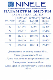 7468 Комплект брючный Этот костюм, выполненный в стиле Шанель, представляет собой элегантное сочетание жакета и классических брюк и гольфа, идеально подходящее как для офисных будней, так и для торжественных случаев. Отделанный тесьмой под жемчуг, этот костюм является воплощением современной классики, способной украсить любой гардероб. Комплект брючный, трех предметный, состоящий из жакета и брюк, выполненные из костюмной ткани и джемпера, выполненного из трикотажного полотна. Жакет полуприлегающего силуэта, длиной по центру спинки 45 см, с центральной бортовой застежкой на 3 петли и пуговицы. Перед с рельефными швами, идущими от пройм до низа, проходящими через центр груди. Правая половинка переда с притачной планкой по борту шириной 3 см. По переду жакета, в верхней и в нижней части расположены настрочные клапаны, в верхний срез которых вставлена декоративная тесьма с жемчугом. Спинка с рельефами от пройм до низа. Горловина переда и спинки круглой формы, по переду углубленная. Рукава втачные, двухшовные. Длина рукава 62 см. Жакет на подкладке, с плечевыми накладками. Брюки классические, зауженные к низу, с посадкой на талии, на притачном поясе, с застёжкой на тесьму-молнию, расположенную в среднем шве передних половинок и 1 петлю и 1 пуговицу на поясе. Передние и задние половинки брюк с талиевыми вытачками, идущими от пояса вниз. Передние половинки брюк с боковыми наклонными карманами. Для лучшего прилегания брюк в области талии в поясе со стороны спинки вставлена резинка. Длина брюк по боковому шву с учетом пояса 102 см. Джемпер полуприлегающего силуэта, длиной по центру спинки 58 см, с воротником стойкой. Перед с нагрудными вытачками, выходящими из пройм. Рукава втачные, одношовные. Длина рукава 60 см.