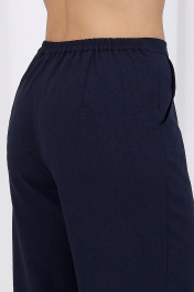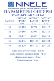 7482 Комплект брючный Этот летний брючный костюм, станет вашей палочкой-выручалочкой для любых ситуаций: деловая встреча, офисный ланч, летняя прогулка или торжественный ужин — вы будете выглядеть безупречно всегда и везде. Если вам нравится изделия из натурального льна, но надоело ходить всегда в мятой одежде, то ткань лен вишер эта ваше находка. Хотя в составе ткани не присутствует лен, она прекрасно дышит и полностью повторяет текстуру натурального льна, а самое главное она практически не мнется. Добавьте в свой гардероб универсальность и элегантность с этим брючным костюмом - тройкой! Комплект брючный 3-х предметный, состоящий из жакета, джемпера и брюк. Жакет полуприлегающего силуэта, выполнен из ткани «лен-вишер». Модель без подкладки, с плечевыми накладками и однобортной внешней застежкой на 5 петель и 5 металлических пуговиц. Перед с нагрудными вытачками, направленными от пройм, и накладными карманами в нижней части. Воротник пиджачного типа. Рукав короткий, втачной. По линии талии переда и спинки настрочены 3 фигурных клапана с пуговицей, выполняющих функцию шлевок для съемного пояса. Длина жакета - 71 см; длина рукава – 28 см. Джемпер полуприлегающего силуэта, выполнен из вискозного трикотажного полотна. Горловина округлой формы, углубленная спереди. Срезы горловины и пройм окантованы косой бейкой. Длина джемпера – 61 см. Брюки классические, с посадкой на талии, выполнены из ткани «лен-вишер». Модель без стрелок, с центральной застёжкой на тесьму-«молнию», на притачном поясе, застегивающемся на петлю и пуговицу. Передние и задние половинки брюк с талиевыми вытачками, направленными от пояса вниз. Спереди обработаны боковые наклонные карманы. Для лучшего прилегания брюк в области талии в поясе по задним половинкам вставлена эластичная лента. Длина брюк по боковому (с поясом) – 106 см.