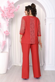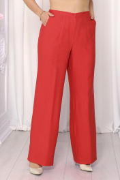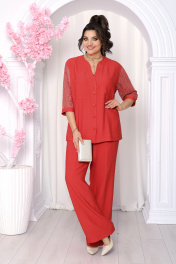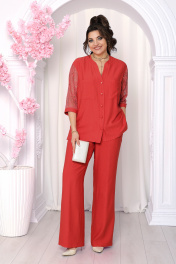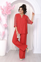 7487 Комплект брючный Основным акцентом этого костюма является блузка, дополненная ажурными кружевными рукавами и вставкой, что придает образу нарядность и легкость, а фигурные планки с пуговицами добавляют деловой акцент — идеальное сочетание для офисного гардероба и праздничных мероприятий. Этот костюм из натуральной ткани — ваш надежный союзник для деловых встреч, вечерних прогулок и летних торжеств. Комплект брючный 2-х предметный, состоящий из блузки и брюк. Блузка прямого силуэта, выполнена из вискозного полотна. Модель без плечевых накладок, с разрезами в боковых швах. Перед с накладными карманами и отрезными фигурными планками, застегивающимися на 5 петель и 5 пуговиц. По середине спинки двухслойная вертикальная вставка (верхний – трикотажное кружево, нижний – хлопковая подкладка в цвет); круглая горловина спинки обработана отрезной фигурной бейкой. Рукав короткий, втачной, выполнен из кружева; по низу притачная манжета из основной ткани (манжета без застежки). Длина блузки – 66 см; длина рукава (с манжетой) – 38 см. Брюки классические, с посадкой на талии, выполнены из вискозного полотна. Модель с центральной застёжкой на тесьму-«молнию», на притачном поясе, застегивающемся на петлю и пуговицу. Передние и задние половинки брюк с талиевыми вытачками, направленными от пояса вниз. Спереди обработаны боковые наклонные карманы. Для лучшего прилегания брюк в области талии в поясе по задним половинкам вставлена эластичная лента. Длина брюк по боковому (с поясом) – 108 см.