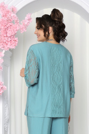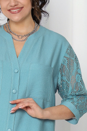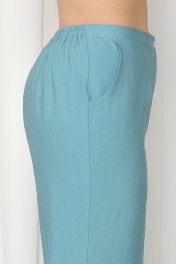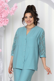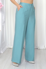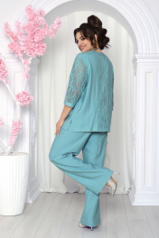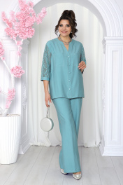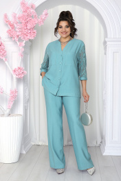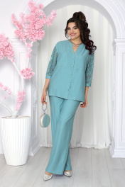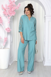 7487 Комплект брючный Основным акцентом этого костюма является блузка, дополненная ажурными кружевными рукавами и вставкой, что придает образу нарядность и легкость, а фигурные планки с пуговицами добавляют деловой акцент — идеальное сочетание для офисного гардероба и праздничных мероприятий. Этот костюм из натуральной ткани — ваш надежный союзник для деловых встреч, вечерних прогулок и летних торжеств. Комплект брючный 2-х предметный, состоящий из блузки и брюк. Блузка прямого силуэта, выполнена из вискозного полотна. Модель без плечевых накладок, с разрезами в боковых швах. Перед с накладными карманами и отрезными фигурными планками, застегивающимися на 5 петель и 5 пуговиц. По середине спинки двухслойная вертикальная вставка (верхний – трикотажное кружево, нижний – хлопковая подкладка в цвет); круглая горловина спинки обработана отрезной фигурной бейкой. Рукав короткий, втачной, выполнен из кружева; по низу притачная манжета из основной ткани (манжета без застежки). Длина блузки – 66 см; длина рукава (с манжетой) – 38 см. Брюки классические, с посадкой на талии, выполнены из вискозного полотна. Модель с центральной застёжкой на тесьму-«молнию», на притачном поясе, застегивающемся на петлю и пуговицу. Передние и задние половинки брюк с талиевыми вытачками, направленными от пояса вниз. Спереди обработаны боковые наклонные карманы. Для лучшего прилегания брюк в области талии в поясе по задним половинкам вставлена эластичная лента. Длина брюк по боковому (с поясом) – 108 см.