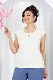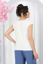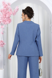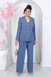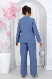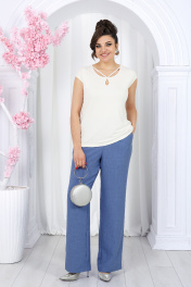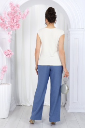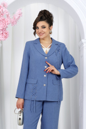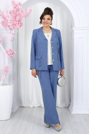 7488 Комплект брючный Этот стильный и универсальный костюм станет идеальным выбором для офиса, деловых встреч и официальных мероприятий. Практичный фасон и качественный материал обеспечивают комфорт в течение всего дня. Жакет с элегантной застежкой и декоративными элементами придает образу солидность. Легкая блуза с оригинальным вырезом смягчает строгий стиль и добавляет женственности. Прямые брюки с идеальной посадкой подчеркивают силуэт и делают костюм удобным для повседневной носки. Этот брючный костюм-тройка – настоящая находка для современной женщины, которая ценит стиль, удобство и универсальность! Комплект брючный 3-х предметный, состоящий из жакета, джемпера и брюк. Жакет однобортный, полуприлегающего силуэта, выполнен из ткани «лен-вишер». Модель частично на хлопковой подкладке (перед и спинка), с плечевыми накладками. Спереди обработаны рельефные швы, направленные от пройм до низа; в нижней части переда расположены прорезные карманы с клапаном. Перед с центральной внешней застежкой на 4 декоративные пуговицы. Спинка со средним швом и рельефными швами, направленными от пройм до низа. Воротник пиджачного типа. Рукав длинный, втачной. Декоративным элементом жакета являются завязки из основной ткани, протянутые в металлические блочки, расположенные параллельными рядами в области левого плеча и под правым карманом. Длина жакета – 65 см; длина рукава – 61 см. Джемпер полуприлегающего силуэта, выполнен из вискозного трикотажного полотна. Горловина переда и спинки округлой формы; спереди окантована и дополнена вырезом «капля» с перемычками, направленными к плечевому шву и закрепленными на пересечении пришивной перламутровой бусиной. Линия плеча спущена, проймы окантованы. Длина джемпера – 57 см. Брюки классические, длинные, с посадкой на талии, выполнены из ткани «лен-вишер». Модель без стрелок. Передние и задние половинки брюк с талиевыми вытачками, направленными от пояса вниз. Спереди обработаны наклонные боковые карманы и центральная застёжка на тесьму-«молнию». Притачной пояс застегивается на 1 петлю и 1 пуговицу; для лучшего прилегания по линии талии в притачном поясе предусмотрена эластичная лента, вставленная по спинке. Длина брюк по боковому (с поясом) – 108 см.