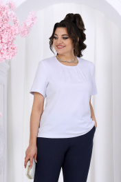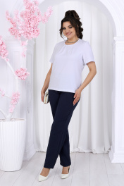 7492 Комплект брючный Этот костюм - идеальное сочетание стиля, комфорта и практичности. Он подойдет как для деловых встреч, так и для повседневного использования, дополняя ваш образ уверенностью и элегантностью. Если вам нравится изделия из натурального льна, но надоело ходить всегда в мятой одежде, то ткань лен вишер эта ваше находка. Хотя в составе ткани не присутствует лен, она прекрасно дышит и полностью повторяет текстуру натурального льна, а самое главное она практически не мнется. Комплект брючный 3-х предметный, состоящий из жакета, джемпера и брюк. Жакет прямого силуэта, выполнен из ткани «лен-вишер». Модель без подкладки, с плечевыми накладками и однобортной внешней застежкой с отрезными планками на 7 петель и 7 пуговиц. Перед с нагрудными вытачками, выходящими из пройм. В нижней части переда настрочены накладные карманы с бантовой складкой посередине кармана и клапаны, застегивающиеся на 1 петлю и 1 пуговицу. По спинке и частично по переду настрочена кулиса, в которую втянут поясок из основной ткани. Для регулировки сборки по кулисе предусмотрены фиксаторы, концы пояса оформлены наконечниками. Горловина округлой формы со стояче-отложным воротником на отрезной стойке. Рукав втачной, длинный, с притачной манжетой, застегивающейся на 1 петлю и 1 пуговицу; по середине рукава настрочена пата, застегивающаяся на 1 петлю и 1 пуговицу, что позволяет регулировать длину рукава. Длина жакета - 71 см (46-50 р-р), 72 см (52-60 р-р), 73 см (62-66 р-р). Длина рукава (с манжетой) - 61 см. Джемпер полуприлегающего силуэта, выполнен из хлопкового трикотажного полотна. Перед с нагрудными вытачками, выходящими из пройм. От горловины вниз застрочены 4 складки. Горловина переда и спинки округлой формы, по переду углубленная. Срезы горловин окантованы косой бейкой. Рукав втачной, короткий. Длина джемпера -60 см (46-50 р-р), 65 см (52-60 р-р), 67 см (62-66 р-р). Длина рукава – 24,5 см (46-50 р-р), 25,5 см (52-60 р-р), 26,5 (62-66 р-р). Брюки классические длинные, прямого силуэта, с посадкой на талии, выполнены из ткани «лен-вишер». Модель без застёжки, на притачном поясе, с эластичной лентой внутри. Передние половинки брюк с боковыми наклонными карманами. Длина брюк по боковому (с поясом)-103 см (46-54 р-р), 104,5 см (56-60 р-р), 106 см (62-66 р-р).