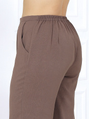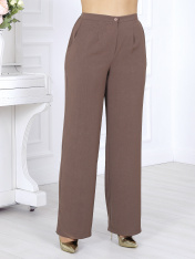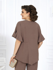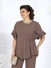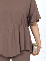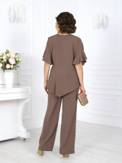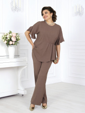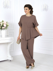 7493 Комплект брючный Костюм идеально подойдёт для офиса, деловых встреч, летних мероприятий и даже вечерних торжеств. Благодаря продуманному крою и мягкому крэш-полотну, костюм не только подчеркивает фигуру, но и создаёт правильный силуэт, визуально вытягивая и стройня силуэт. Комплект брючный 2-х предметный, состоящий из блузки и брюк. Блузка полуприлегающего силуэта, выполнена из крэш-полотна. Модель с цельнокроеным рукавом и асимметричным низом, оформленным углами по середине переда и спинки. В левой части переда обработан прямоугольный подрез, переходящий на спинку и сосборенный по линии талии на узкую эластичную ленту. Горловина округлой формы, окантована косой бейкой из основной ткани. Низ короткого рукава оформлен фигурным воланом. Длина блузки – 74 см (48-56 р-р); длина рукава (от горловины) – 36 см (48 р.), 37 см (50 р.), 38 см (52 р.), 39 см (54 р.), 40 см (56 р.). Брюки классические, длинные, с посадкой на талии, выполнены из крэш-полотна. Модель без стрелок. Передние и задние половинки брюк с талиевыми вытачками, направленными от пояса вниз. Спереди обработаны наклонные боковые карманы и центральная застёжка на тесьму-«молнию». Притачной пояс застегивается на 1 петлю и 1 пуговицу; для лучшего прилегания по линии талии в притачном поясе предусмотрена эластичная лента, вставленная по спинке. Длина брюк по боковому (с поясом) -- 108 см.