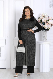 7514 Комплект брючный Вечерний брючный костюм для женщин, созданный специально для торжественных случаев и праздничных вечеров. Модель сочетает комфорт и роскошь, подчеркивая фигуру и скрывая возможные нюансы. Блестящая туника с люрексом струится по силуэту, создавая эффект легкости и изысканности. В комплект входит пояс, акцентирующий талию, и декоративный цветок, добавляющий женственности и шарма. Брюки из мягкого трикотажа «масло» прекрасно сидят и не сковывают движений — идеальный выбор для активных, уверенных в себе женщин. Такой костюм уместен на корпоратив, вечер, семейное торжество, Новый год или просто в ресторан. Комфортный, стильный, универсальный — он станет вашей любимой нарядной вещью, которая всегда уместна. Комплект брючный 2-х предметный, состоящий из туники и брюк. Туника прямого силуэта, комбинированная. Модель представляет собой укороченную нижнюю блузку с рукавами, выполненную из трикотажного полотна «масло» и дополненную двумя длинными отлетными деталями, выполненными из сетки-гофре с нитью «люрекс». Отлетные детали скреплены с нижней блузкой по горловине и плечевым швам. Горловина округлой формы, углубленная спереди; обработана узкой косой бейкой из сетки-гофре. Рукав длинный, втачной. Туника дополнена поясом с застежкой на 1 пуговицу и съемным «цветком», выполненными из сатина. Длина туники - 128 см; длина рукава - 59 см. Брюки классические, длинные, с посадкой на талии, выполнены из трикотажного полотна «масло». Модель без стрелок, без застежки. Спереди обработаны наклонные боковые карманы. Для лучшего прилегания по линии талии в притачном поясе предусмотрена эластичная лента, вставленная по всей длине. Длина брюк по боковому (с поясом) – 107 см.