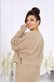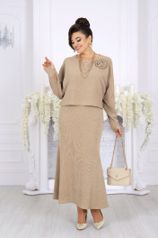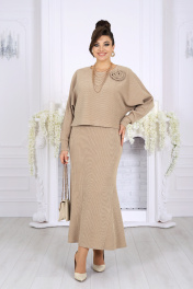 7521 Комплект женский Практичный, стильный и по-настоящему универсальный костюм, который станет базой вашего гардероба и будет радовать не один сезон. Этот костюм создан для женщин, которые ценят комфорт, аккуратную посадку и продуманный дизайн. Фактурный трикотаж с рубчиком мягко ложится по фигуре, визуально вытягивает силуэт и не сковывает движений. Модель отлично подходит для женщин с формами и уверенно смотрится в больших размерах. Платье полуприлегающего силуэта красиво подчеркивает линии фигуры, а притачные клинья по бокам создают плавное расширение к низу, обеспечивая свободу шага и женственный силуэт. Удобная длина делает образ уместным как для деловой обстановки, так и для прогулок или встреч. Свободный джемпер добавляет образу уюта и многослойности: его можно носить поверх платья или отдельно. Разрезы по бокам, мягкая горловина и манжеты с вырезом для большого пальца создают современный, продуманный образ. Съемный декоративный цветок позволяет менять настроение комплекта — от лаконичного до более нарядного. Костюм легко адаптируется под разные случаи: — с аксессуарами и каблуками — для праздничного или делового выхода — с обувью на низком ходу — для комфортных повседневных образов Комплект женский 2-х предметный, состоящий из джемпера и платья. Джемпер свободного силуэта, выполнен из фактурного трикотажного полотна с рубчиком. Модель с разрезами в боковых швах, без подкладки, без застежки и плечевых накладок Горловина круглой формы, углубленная спереди. Рукав длинный, цельнокроеный с деталями переда и спинки; по низу рукава манжета с вырезом для большого пальца. Джемпер дополнен съемным «цветком» из основного полотна. Длина джемпера – 46 см; длина рукава (от горловины) – 77 см. Платье полуприлегающего силуэта, выполнено из фактурного трикотажного полотна с рубчиком. На продолжении боковых швов, в нижней части платья – притачные клинья, придающие силуэту расширение к низу. Модель без подкладки, без застежки и плечевых накладок. Перед с нагрудными вытачками, направленными от пройм, спинка – с талиевыми. Горловина круглой формы, углубленная спереди. Рукав втачной, короткий. Длина платья – 130 см; длина рукава – 22 см.