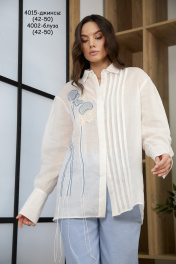 Цвет – “экрю” Легкая стильная блуза эксклюзивного дизайна, прямого силуэта из тонкого льна(рами). Центральная супатная застежка на петли и пуговицы. На левой передней половинке изделия декоративные вертикальные защипы. Спущенная линия плеча, свободный рукав, снизу на притачной широкой манжете. Спинка с отрезной кокеткой и небольшой сборкой. Рубашечный воротник. Дизайнерская вышивка с элементами аппликации по переду изделия.