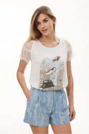 Стильная молодёжная блуза из французского крепа. Модель свободной формы, рукав реглан из французского кружева. Перед модели декорирован стильной дизайнерской печатью.