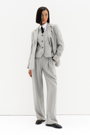 Комплект классического кроя включает в себя жакет, жилет и брюки.
