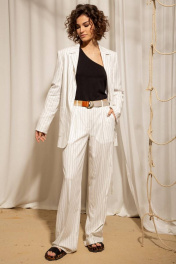 Современный жакет прямого силуэта из льняной ткани в полоску, с застежкой на одну пуговицу. Воротник пиджачного типа с отложными лацканами. Перед с накладными карманы, по боковым швам разрезы. Рукава втачные, длинные с открытыми шлицами по низу с пуговицами. Жакет на хлопковой подкладке, дополнен поясом по талии