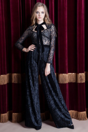 Нарядный джемпер из кружева на сетке с напылением прилегающего силуэта с фигурным вырезом, выделенного бархатной контрастной тесьмой. Воротник-стойка из мягкого велюра, переходящий в завязывающийся бант. Лиф и спинка джемпера двойная. Нижний слой выполнен из сетки телесного цвета. Рукава втачные из кружева на просвет.