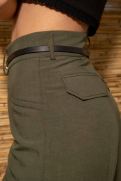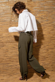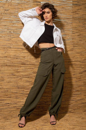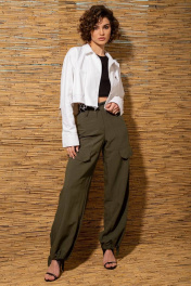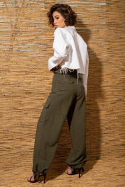 Трендовые брюки-карго из натуральной легкой ткани со свободными, сужающимися к лодыжке, штанинами с двумя большими накладными карманами на бедрах. Спереди горизонтальные подрезы с фигурными клапанами. Пояс притачной с застежкой на пуговицу. На поясе предусмотрены шлевки для одевания ремня. Сзади обработаны нефункциональные карманы с клапанами. Низ брюк с регулирующейся кулисой.