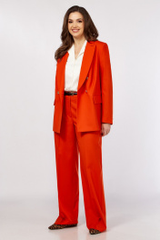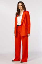 Стильные брюки прямого силуэта из костюмной ткани, расклешенные от бедра, с небольшими складками по переду, переходящими в заутюженные складки, и боковыми наклонными карманами. Пояс цельнокроеный с застежкой на пуговицу и тесьму-молнию. Пояс дополнен шлевками для продевания ремня. Сзади имитация карманов с листочками.