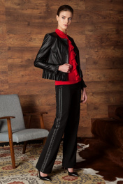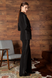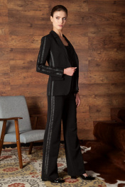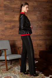Брюки на поясе с застежкой на потайную молнию, расширенные к низу. По бокам обработаны узкие притачные планки с отделочной тесьмой с люрексом.
