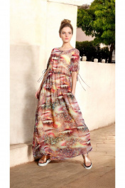Стильное платье из нежного шифона с принтом объемного силуэта oversize с двумя кулисами: по талии и по бедрам, завязывающимися сбоку на шнурки. Горловина углубленная. Рукава втачные длиной до локтя внизу на стягивающей кулиске. Платье на тонкой хлопковой подкладке.