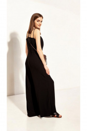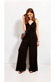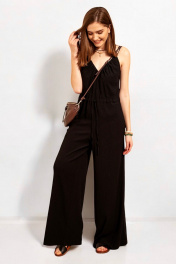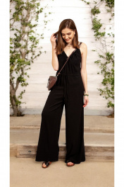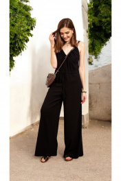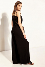 Стильный комбинезон длиной в пол из мягкой фактурной ткани с эффектом «жатки» свободного силуэта с регулируемой кулисой по талии с завязками. Лиф с V-образным вырезом переда и оригинальными тонкими бретелями по переду и спинке. Спинка с застежкой на одну пуговицу и разрезом до талии. В боковых швах обработаны карманы.
