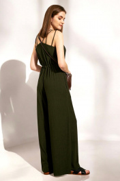 Стильный комбинезон длиной в пол из мягкой фактурной ткани с эффектом «жатки» свободного силуэта с регулируемой кулисой по талии с завязками. Лиф с V-образным вырезом переда и оригинальными тонкими бретелями по переду и спинке. Спинка с застежкой на одну пуговицу и разрезом до талии. В боковых швах обработаны карманы.