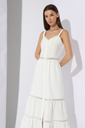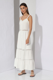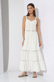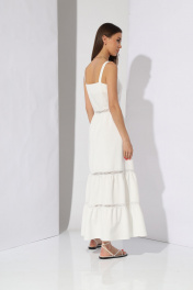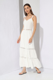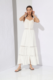 Платье на бретелях. Полуприлегающего силуэта до талии, расширяющееся к низу. Нижняя часть с притачными воланами со сборкой. Застежка – планка на петли и пуговицы. Верхняя часть переда и спинки с вертикальными рельефами. По верхнему, между воланами платье декорировано хлопковым кружевом. Ширина изделия на уровне глубины: 42р – 42см, 44р – 44см, 46р – 46см, 48р – 49см, 50р – 51см. Ширина по линии талии: 42р – 33см, 44р – 35см, 46р – 37см, 48р – 40см, 50р – 42см. Ширина по линии бедер: 42р – 53см, 44р – 55см, 46р – 57см, 48р – 60см, 50р – 62см. Длина по среднему шву спинки: 42-46р – 137см, 48-50р – 138см.