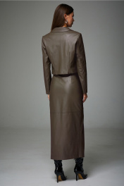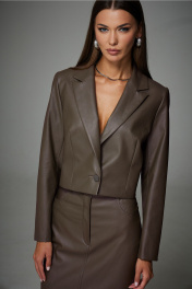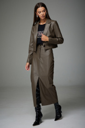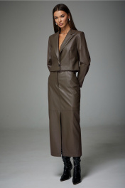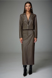 Комплект состоящий из жакета и юбки. Полуприлегающего силуэта, втачного покроя. Выполнен из экокожи на подкладке. Жакет укорочен, закрывает линию талии. Рукав двухшовный, длинный. Горловина обработана воротником пиджачного типа. По переду расположены нагрудные вытачки. Спинка со средним швом и талевыми вытачками. Жакет к низу заужен. Юбка прямого силуэта, к низу заужена. Верхний срез обработан поясом со шлевками для ремня. По переду расположен средний шов с застежкой на гульфик (молния) и разрезом. На переднем и заднем полотнище имеется горизонтальный шов. В боковых швах переднего полотнища расположены карманы закругленной формы. Горизонтальные, вертикальные подрезы, застежка на гульфик, карманы и пояс со шлевками обработаны отделочными строчками. Жакет: Ширина изделия на уровне глубины: 42р – 46см, 44р – 48см, 46р – 50см; Ширина по линии талии: 42р – 42см, 44р – 44см, 46р – 46см; Ширина по линии низа: 42р – 42см, 44р – 44см, 46р – 46см; Длина по среднему шву спинки: 42р – 45см, 44р – 45см, 46р – 45см; Ширина спинки: 42р – 36,5см, 44р – 36,5см, 46р – 36,5см; Ширина плеча: 42р – 11,5см 44р – 11,5см, 46р – 11,5см; Ширина рукава под проймой: 42р – 17см, 44р – 18см, 46р – 19см; Длина рукава:42р – 62см, 44р – 62см, 46р – 62см. Юбка: Ширина по линии талии: 42р – 35см, 44р – 37см, 46р – 39см; Ширина по линии бедер: 42р – 47см, 44р – 49см, 46р – 51см; Длина по боковому шву: 42р – 86см, 44р – 86см, 46р – 86см.