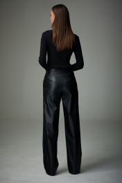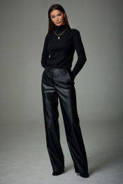 Брюки прямого силуэта. Модель выполнена из экокожи. Верхний срез брюк обработан поясом, карманы наклонные к боковым швам. На передних половинках застежка с гульфиком на тесьму-молнию. В шов притачивания пояса вставлены шлевки. На задних половинах расположены талиевые вытачки. Брюки: Ширина по линии талии: 42р – 34см, 44р – 36см, 46р – 38см, 48р – 40см, 50р – 42см, 52р – 44см; Ширина по линии бедер: 42р – 47см, 44р – 49см, 46р – 51см, 48р – 53см, 50р – 55см, 52р – 57см; Длина по боковому шву: 42р – 46р – 111см, 48-52р – 112см. Ширина брючины внизу: 42р – 23см, 44р – 24см, 46р – 25см, 48р – 26см, 50р – 27см, 52р – 28см; Высота посадки: 42р – 32см, 48-52 – 33см. Длина по внутреннему шву: 42р –52р – 84см.