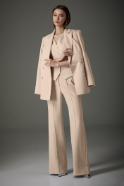 Комплект женский трехпредметный: жакет, жилет, брюки. Жакет: полуприлегающего силуэта, рукав втачной, двухшовный, воротник пиджачного типа. Изделие выполнено из костюмной ткани, на подкладке. Перед имеет смещенную бортовую застежку на две функциональные пуговицы, прорезные карманы в рамку с клапаном. Спинка имеет центральный шов и талевые вытачки. Жилет: полуприлегающего силуэта из костюмной ткани, длиной до уровня бедер. Изделие имеет подкладку только по деталям переда. Перед на центрально-бортовой застежке, оформлен пуговицами в цвет ткани. На уровне талии имитация прорезных карманов в рамку. «V»- образная горловина, фигурный низ изделия. Брюки: расширены к низу от уровня колена. На передней и задней половине отстроченные стрелки. На задней половине расположена кокетка. Жакет: Ширина изделия на уровне глубины: 42р – 46см, 44р – 48см, 46р – 50см, 48р – 52см, 50 – 54см, 52р – 56см. Ширина по линии бедер: 42р -50см, 44р – 52см, 46р – 54см, 48р – 56см, 50 – 58см, 52р – 60см. Длина по среднему шву спинки: 42р - 73см, 44р – 73см, 46р – 73см, 48р – 75см, 50 – 75см, 52р – 75см. Ширина плеча: 42р – 13см, 44р – 13см, 46р – 13см, 48р – 14см, 50 – 14см, 52р – 14см. Ширина рукава под проймой: 42р – 16см, 44р – 17см, 46р – 18см, 48р – 19см, 50 – 19см, 52р – 19см. Длина рукава: 42р-52р -62 см. Брюки: Ширина по линии талии : 42р – 34см, 44р – 36см, 46р – 38см, 48р – 40см, 50 – 42см, 52р – 44см. Ширина по линии бедер: 42р – 47см, 44р – 49см, 46р – 51см, 48р – 52см, 50 – 54см, 52р – 56см. Длина по боковому шву:42р–52р–113см. Ширина брючины внизу: 42р – 23см, 44р – 24см, 46р – 25см. Высота посадки: 42р – 34см, 44р – 34см, 46р – 34см, 48р – 36см, 50 – 36см, 52р – 36см. Длина по внутреннему шву: 42р – 52р – 83см.