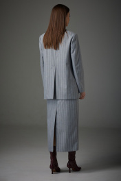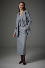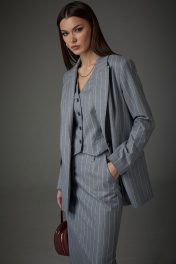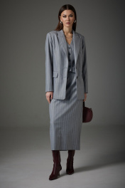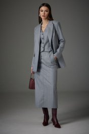 Комплект втачного покроя, свободного силуэта. Состоит из жакета жилета и юбки. Жакет прямого силуэта, на подкладке. Воротник пиджачного типа. Центрально-бортовая застежка на две пуговицы. Рукав двухшовный. Спинка со средним швом, карманы функциональные, прорезные, в рамку, с клапаном. Борта слегка закруглены. Жилет укорочен по линии талии. На переде расположена центрально-бортовая застежка на петли пуговицы, а так же нагрудные вытачки, идущие с низа изделия. На переде расположены горизонтально направленные карманы-обманки в рамку. Горловина V-образной формы, низ – фантазийной формы. Спинка со средним швом и боковыми частями. На спинке расположены хлястики, фиксирующиеся полукольцом. Юбка длиною мидакси. Верхний срез обработан обтачкой. На передней половинке - средний шов с имитацией застежки на гульфик. На переде и заднем полотнище расположены талиевые вытачки и шлевки. В среднем шве заднего полотнища расположены застежка на молнию и шлица. Жакет: Ширина изделия на уровне глубины: 42р – 48,5см, 44р – 50,5см, 46р – 52,5см, 48 – 54,5см, 50 – 56,5см, 52 – 58,5см. Ширина по линии бедер: 42р – 50см, 44р – 52см, 46р – 54см, 48 – 56см, 50 – 58см, 52 –60см. Длина по среднему шву спинки: 42р – 75см, 44р – 75см, 46р – 75см, 48 – 75,5см, 50 – 75,5см, 52 – 75,5см. Ширина плеча: 42р – 13см, 44р – 13см, 46р – 13см, 48 – 13,5см, 50 – 13,5см, 52 – 13,5см. Ширина рукава под проймой: 42р – 16см, 44р – 17см, 46р – 18см, 48 – 19см, 50 – 20см, 52 – 20,5см. Длина рукава: 42р – 63см, 44р – 63см, 46р – 63см, 48 – 63см, 50 – 63см, 52 – 63см. Жилет: Ширина изделия на уровне глубины: 42р – 44см, 46р – 46см, 46р – 48см, 48р – 50см, 50р – 52см, 52р – 54см. Ширина по линии низа: 42р – 40см, 44р – 42см, 46р – 44см, 48р – 46см, 50р – 48см, 52р – 50см. Длина по среднему шву спинки: 42р – 44см, 44р – 44см, 46р – 44см, 48р – 46см, 50р – 46см, 52р – 46см. Ширина плеча: 42р – 11см, 44р – 11см, 46р – 11см, 48р –12см, 50р – 12см, 52р – 12см. Юбка: Ширина по линии талии: 42р – 34см, 44р – 36см, 46р – 38см, 48р – 40см, 50р – 42см, 52р – 44см. Ширина по линии бедер: 42р – 47см, 44р – 49см, 46р – 51см, 48р – 53см, 50р – 55см, 52р – 57см. Длина по боковому шву: 88см.