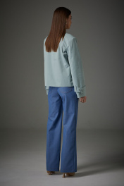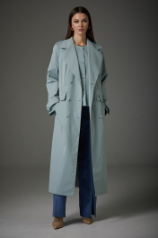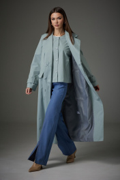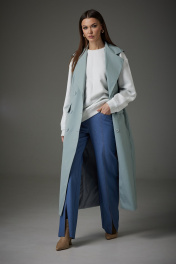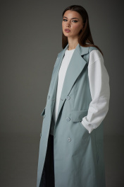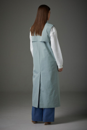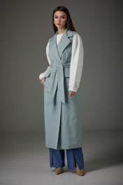 Комплект женский, прямого силуэта, состоящий из жакета и жилета. Изделия на подкладке. Жакет укорочен с центрально-бортовой застежкой на петли пуговицы, горловина округлой формы, рукава прямые одношовные, полной длины. По низу рукава расположены шлевки с патой, фиксирующейся на пуговице. Жилет удлиненный до середины икры, застежка двубортная на петли-пуговицы. Горловина оформлена воротником пиджачного типа. На спинке расположен средний шов со шлицей. К комплекту прилагается пояс из основной ткани. Жакет: Ширина изделия на уровне глубины: 42р – 50см, 44р – 52см, 46р – 54см, 48р – 56см, 50р – 58см, 52р – 60см. Ширина по линии бедер: 42р – 54см, 44р – 56см, 46р – 58см, 48р – 60см, 50р – 62см, 52р – 64см. Ширина рукава под проймой: 42р – 18см, 44р – 19см, 46р – 20см, 48р – 20см, 50р – 21см, 52р – 22см. Длина рукава: 42-52р – 62см. Жилет: Ширина изделия на уровне глубины: 42р – 50см, 44р – 52см, 46р – 54см, 48р – 56см, 50р – 58см, 52р – 60см. Ширина по линии бедер: 42р – 54см, 44р – 56см, 46р – 58см, 48р – 60см, 50р – 62см, 52р – 64см. Длина по среднему шву: 42-52р – 130-131см. Ширина пояса: 42-52р – 6см.