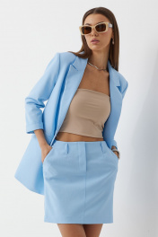 Комплект женский, трехпредметный, состоящий из жакета, топа и юбки. Жакет частично на подкладке, втачного покроя, с центрально-бортовой застежкой на две пуговицы. Горловина оформлена воротником пиджачного типа. Рукав ¾ двушовный с притачной манжетой по низу. Жакет состоит из переда, спинки и бочка. На переде расположены нагрудные вытачки и прорезные карманы в рамку с клапаном. По низу борта закругленные. Спинка со средним швом. Жакет оверсайз слегка прилегающего силуэта. Юбка прямая, укороченная, переднее полотнище со швом, в котором расположена застежка на гульфик. На переде расположены наклонные боковые карманы. Верхний срез юбки обработан обтачкой. Подкладка кармана является отделкой, видна по низу, контрастного цвета. На заднем и переднем полотнище расположены талевые вытачки. Топ (бандо) выполнен из эластичного полотна, двухсторонний, приталенного силуэта, без бретелей. Жакет: Ширина изделия на уровне глубины: 42р – 51см, 44р – 53см, 46р – 55см, 48р – 57см, 50р – 59см, 52р – 61см Ширина по линии талии: 42р – 50см, 44р – 52см, 46р – 54см, 48р – 56см, 50р – 58см, 52р – 60см Ширина по линии бедер: 42р – 53см, 44р – 55см, 46р – 57см, 48р – 59см, 50р – 61см, 52р – 63см Длина по среднему шву спинки: 42-46р - 74см, 48-52р – 75см Ширина спинки: 42-46р - 40см, 48-52р – 43см Ширина плеча: 42-46р – 13,5см, 48-52р – 14см Ширина рукава под проймой: 42р – 16,5см, 44р – 17,5см, 46р – 18,5см, 48р – 19,5см, 50р – 20,5см, 52р – 21,5см Длина рукава: 47см Юбка: Ширина по линии талии: 42р – 34см, 44р – 36см, 46р – 38см, 48р – 40см, 50р – 42см, 52р – 44см Ширина по линии бедер: 42р – 47см, 44р – 49см, 46р – 51см, 48р – 53см, 50р – 55см, 52р – 57см Длина по боковому шву: 42-46р – 44см, 48-52р – 46см Топ: Ширина изделия на уровне глубины: 42р – 34см, 44р – 36см, 46р – 38см, 48р – 40см, 50р – 42см, 52р – 44см Ширина по линии талии: 42р – 31см, 44р – 32см, 46р – 33см, 48р – 34см, 50р – 35см, 52р – 36см Длина по среднему шву спинки: 42-46р – 20см, 48-52р – 22см