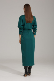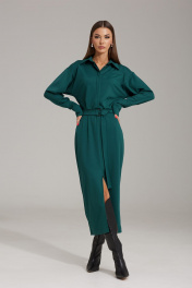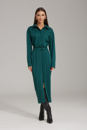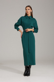 Платье полуприлегающего силуэта, со спущенным плечом, выполнено из трикотажного полотна, отрезное по талии. Верхняя часть переда и спинки более свободной формы. На переде расположена потайная планка на петли-пуговицы до подрезной линии. На левой детали переда в области груди расположена прорезная листочка – обманка. Воротник стояче-отложной с отрезной стойкой. В верхней части переда и спинки заложены односторонние складки, направленные к боковому шву. В нижней части переда расположен переходящий в разрез средний шов. На талии, по переду и спинке расположены вытачки. К платью прилагается пояс из основной ткани. Отделкой в данной модели служит фурнитура контрастного цвета. Ширина изделия на уровне глубины: 42р – 47см, 44р – 49см, 46р – 51см; Ширина по линии талии: 42р – 34см, 44р – 36см, 46р – 38см; Ширина по линии бедер: 42р – 46см, 44р – 48см, 46р – 50см; Ширина рукава под проймой: 42-46р – 23см; Длина рукава от горловины: 42р – 74см, 44р – 75см, 46р – 76см; Длина по среднему шву спинки: 42-46р – 130 см; Длина ремня, пояса – 130см.