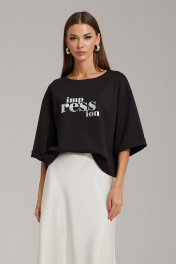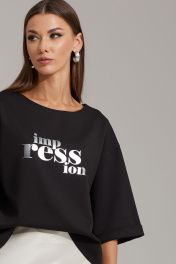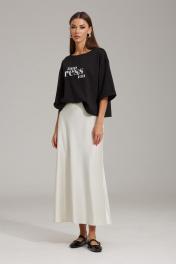 Комплект женский, состоящий из джемпера и юбки. Джемпер выполнен из трикотажного полотна, прямого силуэта, покроя спущенное плечо (оверсайз). Рукава одношовные с цельнокроеной манжетой, длина до локтя. Джемпер укорочен, по переду расположена печать. Юбка выполнена по косой, к низу расширена. Верхний срез на обтачке, по спинке – талиевые вытачки, в левом боковом шве – застежка на потайную тесьму-молнию. Джемпер: Ширина изделия на уровне глубины: 42р – 54см, 44р – 56см, 46р – 58см, 48р – 59см, 50р – 61см, 52р – 63см; Ширина по линии бедер: 42р – 58см, 44р – 60см, 46р – 62см, 48р – 63см, 50р – 65см, 52р – 67см; Ширина рукава под проймой: 42р – 19,5см, 44р – 19,5см, 46р – 19,5см, 48р – 21см, 50р – 21см, 52р – 21см; Длина по среднему шву спинки: 42-46р – 52см; 48-52р – 54см; Ширина плеча: 42р – 17,5см, 44р – 18см, 46р – 18,5см, 48р – 19см, 50р – 19,5см, 52р – 20,5см; Длина рукава от горловины: 42-46р – 46см; 48-52р – 48см. Юбка: Ширина по линии талии (без натяжения резинки): 42р – 33см, 44р – 35см, 46р – 37см, 48р – 39см, 50р – 41см, 52р – 43см; Ширина по линии бедер: 42р – 48см, 44р – 50см, 46р – 52см, 48р – 54см, 50р – 56см, 52р – 58см; Длина по боковому шву: 42-52р – 92см.