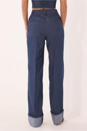 Комплект женский, состоит из штруксового жакета (на подкладке) и джинсовых брюк. Жакет классической формы с центрально-бортовой застежкой на две пуговицы. Воротник пиджачного типа. Рукав длинный, двухшовный, плечо слегка расширено. По переду – нагрудная вытачка, переходящая в горизонтальный подрез, в котором обработаны прорезные карманы в рамку, с клапаном. Спинка со средним швом, заканчивающимся шлицей и бочками. Брюки расширены к низу. На передней и задней половинках отстрочены стрелки до контрольных точек. На задней половинке – кокетка и накладные карманы. Напередней половинке – боковой карман, с правой стороны – маленький накладной кармашек. Верхний срез обработан поясом со шлевками. Низ брюк с широкой манжетой на изнаночную сторону джинса. Жакет: Ширина изделия на уровне глубины: 42р – 48,5см, 44р – 50,5см, 46р – 52,5см, 48р – 54,5см, 50р – 56,5см, 52р – 58,5см; Ширина по линии бедер: 42р – 50см, 44р – 52см, 46р – 54см, 48р – 56см, 50р – 58см, 52р –60см; Длина по среднему шву спинки: 42р – 75см, 44р – 75см, 46р – 75см, 48р – 76см, 50р – 76см, 52р – 76см; Ширина плеча: 42р – 13см, 44р – 13см, 46р – 13см, 48 – 14см, 50 – 14см, 52 – 14см; Ширина рукава под проймой: 42р – 16см, 44р – 18см, 46р – 19см, 48р – 20см, 50р – 21см, 52р – 22см; Длина рукава: 42р – 62см, 44р – 62см, 46р – 62см, 48р – 62см, 50р – 62см, 52р – 62см. Брюки: Ширина по линии талии(без натяжения резинки): 42р – 33см, 44р – 35см, 46р – 37см, 48р – 39см, 50р – 41см, 52р – 43см; Ширина по линии бедер: 42р – 46см, 44р – 48см, 46р – 50см, 48р – 52см, 50р – 54см, 52р – 56см; Длина по боковому шву (без пояса): 42р – 107см, 44р – 107см, 46р – 107см, 48р – 107см, 50р – 107см, 52р – 107см; Ширина брючины внизу: 42р – 25см, 44р – 26см, 46р – 27см, 48р – 28см, 50р – 29см, 52р – 30см; Высота посадки: 42р – 35см, 44р – 35см, 46р – 35см, 48р – 37см, 50р – 37см, 52р – 37см; Длина по внутреннему шву: 42р – 83см, 44р – 83см, 46р – 83см, 48р – 82см, 50р – 82см, 52р – 82см.