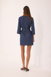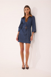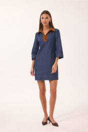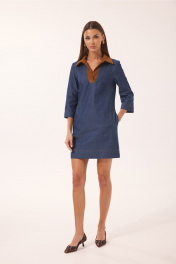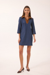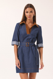 Платье женское полуприлегающего силуэта, слегка расширенное к низу, с воротником и планкой из отделочной ткани (штрукса). По переду нагрудные вытачки, направленные снизу вверх и отстроченные отделочными нитками. По спинке средний шов и горизонтальная кокетка. Рукав ¾, к низу слегка расширенный. Горловина оформлена стояче-отложным воротником с отрезной стойком и планкой, без застежки. Платье дополнено съемным поясом на пряжке. В боковых швах платья боковые карманы. Ширина изделия на уровне глубины: 42р – 45см, 44р – 47см, 46р – 49см, 48р – 51см; Ширина по линии бедер: 42р – 48см, 44р – 50см, 46р – 52см, 48р – 54см; Длина по среднему шву спинки: 42р-46р – 85см, 48р – 90 см; Ширина плеча: 42р-46р – 11см, 48р – 12см; Ширина рукава под проймой: 42р – 15см, 44р – 16см, 46р – 17см, 48р – 18см; Длина рукава: 42р –48р – 45см.