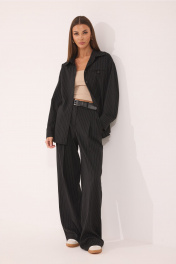 Костюм женский, состоящий из блузы и брюк, выполнен из ткани в полоску. Блуза женская прямого силуэта, покроя спущенное плечо, свободной формы. Горловина оформлена стояче-отложным воротником с отрезной стойкой. Застежка центрально-бортовая на петли-пуговицы. На левой части переда выполнен прорезной карман в рамку (имитация), с рамками по косой и петелькой. Низ блузы фигурной формы. Спинка состоит из кокетки (полоска поперек) и нижней части. Рукав двушовный, по низу обработан манжетой, застегивающейся на две пуговицы. Брюки «палаццо», свободные, прямого силуэта. Верхний срез брюк обработан поясом и шлевками для фиксации ремня. В боковых швах расположены накладные карманы. На передних и задних половинках застежка на гульфик (тесьму-молнию), а также по две складки, застроченные сверху до определенного уровня, направлены к боковому шву. На передних и задних половинках заутюжены «стрелки». На задних половинах расположены по две талевые вытачки. Блуза: Ширина изделия на уровне глубины: 42р – 49см, 44р – 51см, 46р – 53см, 48р – 55см, 50р – 57см, 52р – 59см; Ширина по линии бедер: 42р –52см, 44р – 54см, 46р – 56см, 48р – 58см, 50р – 60см, 52р – 62см; Длина по среднему шву спинки: 42р-46р – 70см, 48-52р – 72см; Ширина плеча: 42р-46р – 18см, 48-52р – 19см; Ширина спинки: 42р-46р – 47см, 48-52р – 49см; Ширина рукава под проймой: 42р – 22см, 44р – 23см, 46р – 24см, 48р –24см, 50р – 25см, 52р – 26см; Длина рукава с манжетой: 42р-46р – 55см, 48-52р – 56см. Брюки: Ширина по линии талии: 42р – 36 см, 44р – 38см ,46 – 40см,48р – 42см, 50р – 44 см, 52р – 46см; Ширина по линии бедер: 42р – 57см, 44р – 59см, 46р – 61 см, 48р – 63см, 50р – 65см, 52р – 67см; Длина по боковому шву: 42-46р – 111см; 48-52р – 112см; Длина по внутреннему шву: 42-46р – 83см; 48-52р – 81см; Высота посадки: 42-46р – 35,5см; 48-52р – 38 см; Ширина брюк внизу: 42р – 30см, 44р – 31см, 46р – 32см, 48р – 32см, 50р – 33см, 52р – 34см.