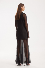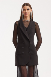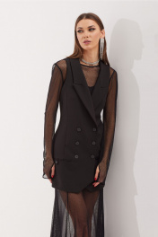 Платье-жилет выполнено на подкладке из костюмной ткани, полуприлегающего силуэта, втачного покроя с двубортной застежкой по три пары пуговиц. Горловина оформлена воротником пиджачного типа. В области бедер расположены прорезные карманы в рамку с петелькой и пуговицей. Спинка состоит из центральных и боковых частей. По переду расположены бочки и нагрудные вытачки. Ширина изделия на уровне глубины: 42р – 44см, 44р – 46см, 46р – 48см; Ширина по линии талии: 42р – 39см, 44р – 41см, 46р – 43см; Ширина по линии бедер: 42р – 48см, 44р – 50см, 46р – 52см; Длина по среднему шву спинки: 42-46р – 79см; Ширина плеча: 42-46р – 6,5см.