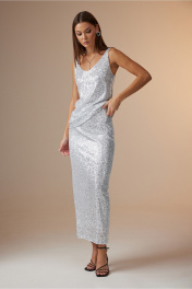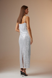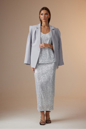 Комплект женский трехпредметный: жакет, топ, юбка. Жакет: полуприлегающего силуэта с двухбортной застежкой на одну пуговицу. Воротник пиджачного типа. Рукав длинный, трехшовный – дополнительный шов по центру верхней половинки для создания объема рукава, так же в швы верхних половин рукава вставлено крылышко для расширения линии плеча. По переду отрезной бочок, от него нагрудная вытачка и карманы в шве. Спинка со средним швом, отрезным бочком и талиевыми вытачками. Топ: полуприлегающего силуэта на бретелях, выполнен из отделочной трикотажной ткани, с «пайетками», на трикотажной подкладке. Вырез горловины «V»-образный, с регулируемыми бретелями по длине. Юбка: длинная, зауженная к низу, с цельнокроенным поясом на резинке. Выполнена из трикотажного полотна с «пайтками». Заднее полотнище юбки со средним швом, в котором расположен разрез выше уровня колена. Изделие на трикотажной подкладке. Фурнитура может отличаться от фото, не изменяя художественному образу. Жакет: Ширина изделия на уровне глубины: 42р – 45см, 44р – 47см, 46р – 49см, 48р – 51см, 50р – 53см, 52р – 55см; Ширина по линии талии: 42р – 37см, 44р – 39см, 46р – 41см, 48р – 43см, 50р – 45см, 52р – 47см; Ширина по линии бедер: 42р -48см, 44р – 50см, 46р – 52см, 48р – 54см, 50р – 56см, 52р – 58см; Длина по среднему шву спинки: 42р - 67см, 44р – 67см, 46р – 67см, 48р – 68см, 50р – 68см, 52р – 68см; Ширина спинки: 42-46р – 17см, 48-52р – 19см; Ширина плеча: 42-46р – 11см, 48-52р – 12см; Ширина рукава под проймой: 42р – 19см, 44р – 20см, 46р – 21см, 48р – 21см, 50р – 22см, 52р – 23см; Длина рукава: 42р-52р -63 см. Топ: Ширина изделия на уровне глубины: 42р – 42см, 46р – 44см, 46р – 46см, 48р – 48см, 50р – 50см, 52р – 52см; Ширина по линии талии: 42р – 42см, 44р – 44см, 46р – 46см, 48р – 48см, 50р – 50см, 52р – 52см; Ширина по линии бедер: 42р – 48см, 44р – 50см, 46р – 52см, 48 – 54см, 50р – 56см, 52 – 58см; Длина по линии расположения шлейки: 42р – 62см, 44р – 62см, 46р – 62см, 48 – 63см, 50р – 63см, 52 – 63см; Ширина шлейки: 42р – 0,9см, 44р – 0,9см, 46р – 0,9см, 48 – 0,9см, 50р – 0,9см, 52 – 0,9см; Ширина по линии талии: 42р – 42см, 44р – 44см, 46р – 46см, 48 – 48см, 50р – 50см, 52 –52см. Юбка: Ширина по линии талии: 42р – 31см, 44р – 33см, 46р – 35см, 48р – 37см, 50р – 39см, 52р – 41см; Ширина по линии бедер: 42р – 46см, 44р – 48см, 46р – 50см, 48р – 52см, 50р – 54см, 52р – 56см; Длина по боковому шву: 42р – 94см, 44р – 94см, 46р – 94см, 48р – 94см, 50р – 94см, 52р – 94см.