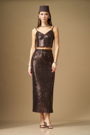 Комплект женский, состоит из жакета, юбки и топа. Жакет прилегающего силуэта со спущенным плечом, с центрально-бортовой застежкой на одну пуговицу в области талии. Горловина У-образной формы с расходящимся закругленным краем борта внизу. По переду рельеф от плеча, переходящий в подрез, в котором выполнены карманы в рамку. На правой центральной части сверху выполнена два кармана в рамку разной длины (имитация) Спинка со средним швом и двумя рельефами от плеча. Рукав длинный, двухшовный, снизу с вытачкой, для увеличения объема рукава в верхней части. Жакет на подкладке. Юбка женская, зауженная книзу, с цельнокроеным поясом, на резинке. Заднее полотнище со средним швом, в котором расположен разрез. Юбка выполнена из ткани с пайетками, на трикотажной подкладке. Юбка длиной «мидакси». Топ приталенного силуэта, выполнен из ткани с пайетками, на трикотажной подкладке. Топ на бретелях с регуляторами длины. Перед с У-образным вырезом. Перед и спинка имеют рельефные линии. В левый боковой шов вставлена потайная молния. Жакет: Ширина изделия на уровне глубины: 42р – 45см, 44р – 47см, 46р – 49см, 48р – 51см, 50р – 53; Ширина по линии талии: 42р – 38см, 44р – 40см, 46р – 42см, 48р – 44см, 50р – 46см; Ширина по линии бедер: 42р – 48,5см, 44р – 50,5см, 46р – 52,5см, 48р – 54,5см, 50р –56,5см; Длина по среднему шву спинки: 42р – 66см, 44р – 66см, 46р – 66см, 48р – 68см, 50р – 68см; Ширина плеча: 42р – 18см, 44р – 19см, 46р – 20см, 48р – 20см, 50р – 21см; Ширина рукава под проймой: 42-46р – 21см, 48р – 23см, 50р – 23см; Длина рукава от плеча: 73см. Юбка: Ширина по линии талии: 42р – 31см, 44р – 33см ,46 – 35см, 48р – 37см, 50р – 39см; Ширина по линии бедер: 42р – 46см, 44р – 48см, 46р – 50см, 48р – 52см, 50р – 54см; Длина по боковому шву: 94см. Топ: Ширина изделия на уровне глубины: 42р – 39см, 44р – 41см, 46р – 43см, 48р – 45см, 50р –47см; Ширина по низу: 42р – 34см, 44р – 36см, 46р – 38см, 48р – 40см, 50р – 42см; Длина по среднему шву спинки: 16см.