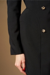 Платье женское полуприлегающего силуэта, выполнено из костюмной ткани на подкладке. Платье с двубортной застежкой на две пары пуговиц, с фигурным низом. Воротник пиджачного типа. По переду рельеф от плечевого шва, проходящий через центр груди, бочок отрезной из проймы. По спинке средний шов, рельеф от плеча и бочок из проймы. По боковым швам переда и спинки вставлены фигурные подрезы, зрительно расширяющие линию бедер. Рукава втачные, двухшовные, полноценной длины. Фурнитура может незначительно отличаться, не изменяя художественному образу. Ширина изделия на уровне глубины: 42р – 45см, 44р – 47см, 46р – 49см, 48р – 51см, 50р – 53см; Ширина по линии талии: 42р – 35см, 44р – 37см, 46р – 39см, 48р – 41см, 50р – 43см; Ширина по линии бедер: 42р – 50см, 44р – 52см, 46р – 54см, 48р – 56см, 50р – 58см; Длина по среднему шву спинки: 84см; Ширина спинки: 42-46р – 36см, 48-52р – 38см; Ширина плеча: 42-46р – 13см, 48-52р – 14см; Ширина рукава под проймой: 42р – 16,5см, 44р – 17,5см, 46р – 18,5см, 48р – 19,5см, 50р – 20,5см; Длина рукава: 61см.