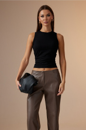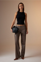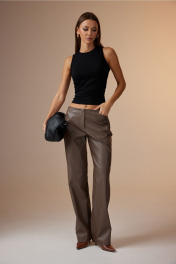 Брюки выполнены из экокожи. Брюки прямого силуэта, с горизонтальными подрезами на уровне колена. Верхний срез брюк обработан обтачками. На передних половинках выполнены карманы виде фигурных подрезов. На правой задней половинке выполнен прорезной карман с листочкой (имитация). Застежка на тесьму-молнию и маленькую кнопку. Ширина по линии талии: 42р – 33см, 44р – 35см, 46 – 37см, 48р – 39см, 50р – 41см, 52р – 43см; Ширина по линии бедер: 42р – 46см, 44р – 46см, 46р – 50см, 48р – 52см, 50р – 54см, 52р – 56см; Длина по боковому шву: 42-46р – 107см; 48-52р – 107см; Длина по внутреннему шву: 42-46р – 85см; 48-52р – 84см; Высота посадки: 42-46р – 27см; 48-52р – 28см; Ширина брюк внизу: 42р – 24см, 44р – 25см, 46р – 26см, 48р – 26см, 50р – 27см, 52р – 28см.