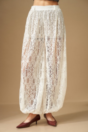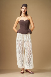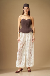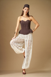 Комплект женский, состоит из корсета и Брюк. Корсет плотно-прилегающего силуэта, с отрезными расширенными вставками-бочками, идущими от талии вниз. По переду и спинке, по всем рельефным линиям вставлены косточки (отделочные строчки по 7мм). На спинке по среднему шву вставлена разъемная молния. По переду фигурный вырез. Корсет на подкладке. Брюки свободной формы, с низкой посадкой, сильно расширенные и собранные снизу на резинку, выполнены из кружевного полотна. Верхний срез обработан поясом на резинке, центр переда без резинки, пояс со шлевками. В пояс притачены короткие шорты из трикотажного полотна. Брюки по силуэтной форме – Алладины. Корсет: Ширина изделия на уровне глубины: 42р – 38см, 44р – 40см, 46р – 42см, 48р – 44см; Ширина по низу: 42р – 31см, 44р – 33см, 46р – 35см, 48р – 37см; Длина по среднему шву спинки: 30см. Брюки: Ширина по линии талии: 42р – 31см, 44р – 33см ,46 – 35см,48р – 37см; Ширина по линии бедер: 64см; Длина по боковому шву: 106см; Высота посадки: 34см; Длина по внутреннему шву: 81см.